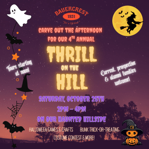 Join us on Saturday October 25th for our 4th annual Thrill on the Hill fall celebration. This event is open to all former, current, and prospective families! Come tour camp, see the beautiful foliage, meet our staff, and participate in some fun games and activities.